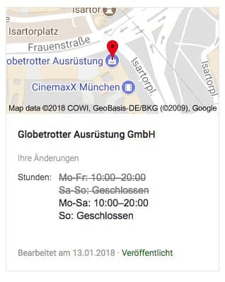 Meine Änderungen bei Google Maps wurde veröffentlicht. Die Öffnungszeiten vom @globetrotter in München stimmen jetzt.