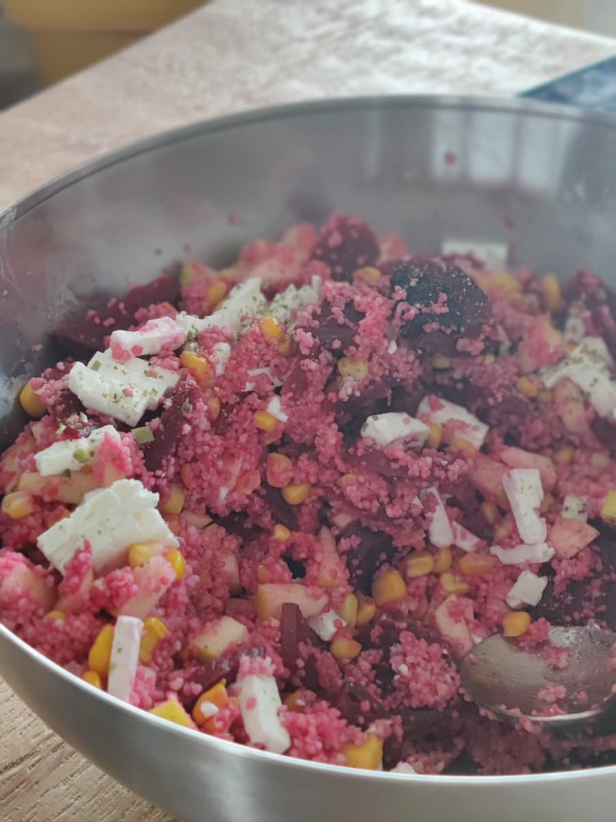 Es gibt Couscous, Feta, Rote Beete, Mais Salat. Einfach, aber ich mag es.